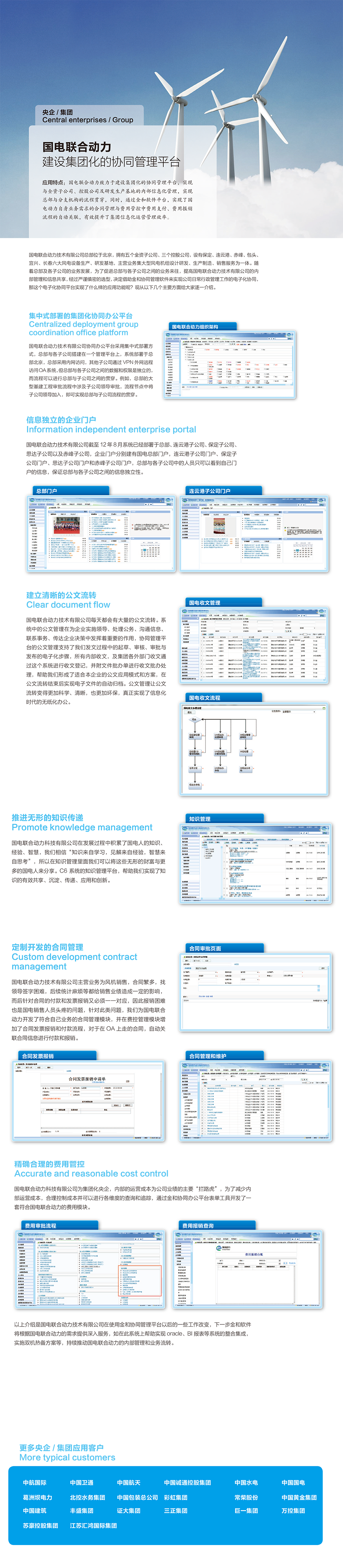 國電聯(lián)合動力技術(shù)有限公司總部位于北京,擁有五個全資子公司、三個控股公司,設(shè)有保定、連云港、赤峰、包頭、宜興、長春六大風(fēng)電設(shè)備生產(chǎn)、研發(fā)基地,主營業(yè)務(wù)集大型風(fēng)電機組設(shè)計研發(fā)、生產(chǎn)制造、銷售服務(wù)為一體。隨著總部及各子公司的業(yè)務(wù)發(fā)展,為了促進總部與各子公司之間的業(yè)務(wù)來往,提高國電聯(lián)合動力技術(shù)有限公司的內(nèi)部管理和信息共享,經(jīng)過嚴(yán)謹(jǐn)縝密的選型,決定借助金和協(xié)同管理軟件來實現(xiàn)公司日常行政管理工作的電子化協(xié)同,那這個電子化協(xié)同平臺實現(xiàn)了什么樣的應(yīng)用功能呢?現(xiàn)從以下幾個主要方面給大家逐一介紹。