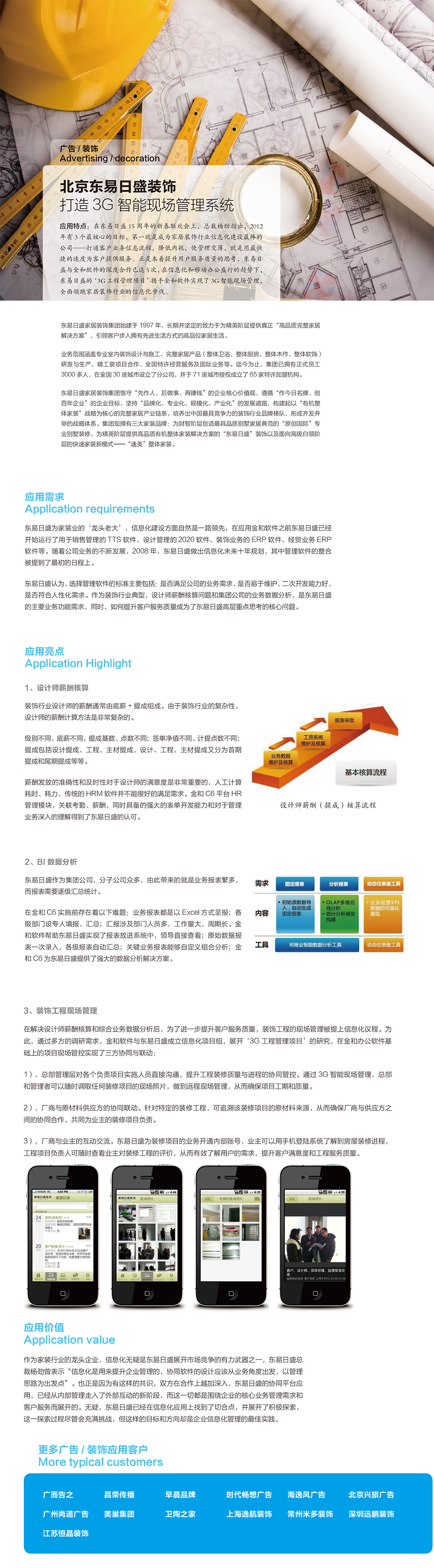 在東易日盛 15 周年的新春聯(lián)歡會(huì)上,總裁楊勁指出,2012年有 3 個(gè)最核心的目標(biāo),第一就是成為家居裝飾行業(yè)信息化建設(shè)最棒的公司——打通客戶業(yè)務(wù)信息流程,降低內(nèi)耗,使管理變薄,就是用最快捷的速度為客戶提供服務(wù)。正是本著提升用戶服務(wù)質(zhì)量的思考,東易日盛與金和軟件的深度合作已達(dá)5次,在信息化和移動(dòng)辦公盛行的趨勢下,東易日盛的‘3G工程管理項(xiàng)目’攜手金和軟件實(shí)現(xiàn)了3G智能現(xiàn)場管理,全面領(lǐng)跑家居裝飾行業(yè)的信息化步伐。
